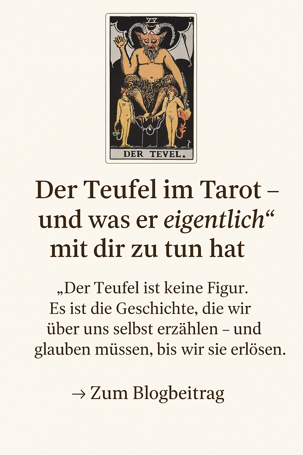 Was bedeutet die Tarotkarte „Der Teufel“ wirklich? In diesem persönlichen Beitrag teile ich meine tiefe Erkenntnis zur Karte Der Teufel im Rider-Waite-Tarot – jenseits von Angst, Drama und alten Deutungen. Erfahre, warum der Teufel kein Feind ist, sondern ein Spiegel deiner inneren Fesseln – und wie du sie liebevoll und kraftvoll lösen kannst.